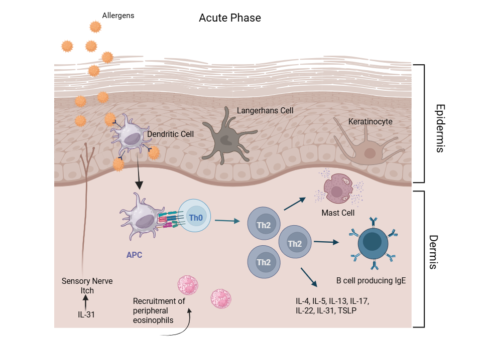 - Acute Phase8: Lesions are predominantly infiltrated by Th2 lymphocytes. Activated Th2 cells secrete cytokines (e.g., IL-4, IL-5, IL-6, IL-9, IL-10, IL-13) that promote B cell class switching to IgE, stimulate eosinophil recruitment, and induce mast cell degranulation. These responses culminate in immediate hypersensitivity reactions and amplify the inflammatory cascade.