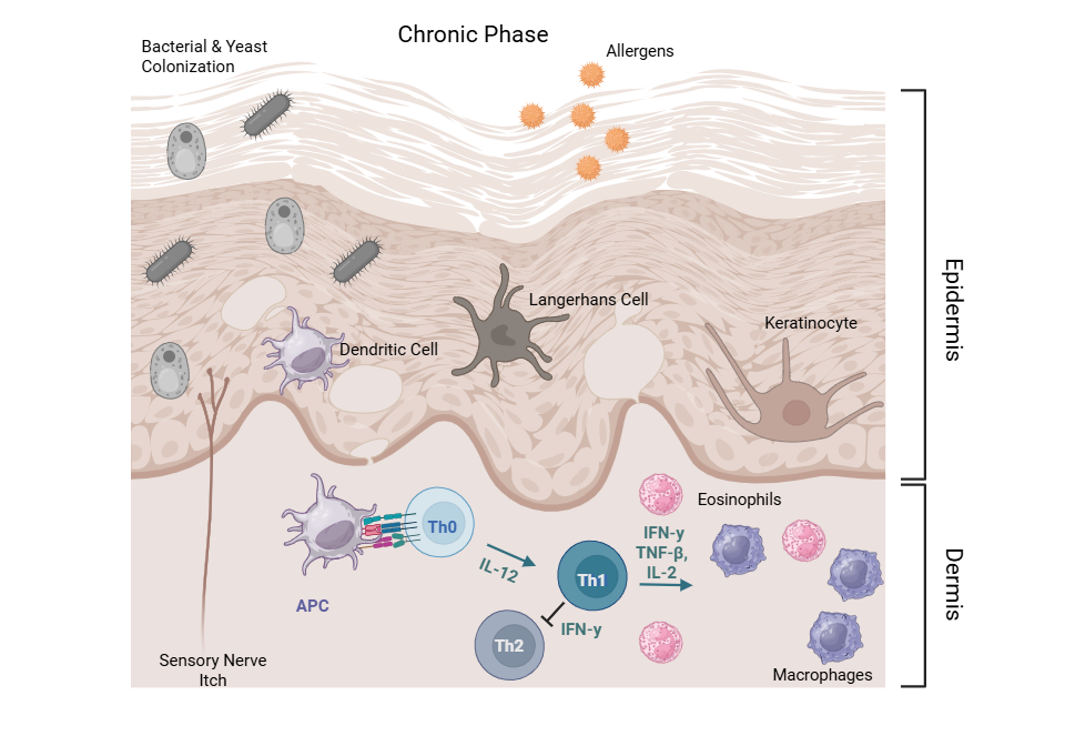 - Chronic Phase8: Chronic lesions show a mixed Th1/Th2 profile, with increased Th1 cell infiltration. Resulting Th1 cytokines such as interferon-gamma (IFN-γ), tumor necrosis factor-beta (TNF-β), and IL-2 mediate delayed-type hypersensitivity and sustain cellular inflammation by activating macrophages and cytotoxic T cells. IFN-γ also acts to downegulate Th2-mediated IgE synthesis, reflecting a regulatory shift in the chronic disease state.