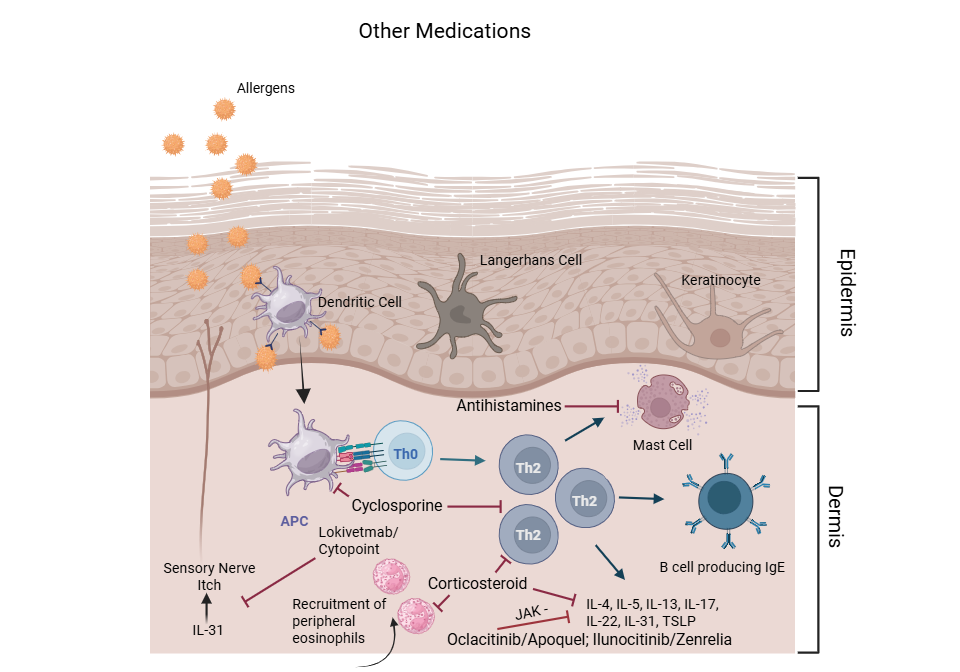 The immunopathogenesis of CAD is driven by dysregulated activation of T helper 2 (Th2) lymphocytes, which play a central role in initiating and perpetuating skin inflammation. Th2 cells secrete a range of pro-inflammatory cytokines, including interleukin (IL)-4, IL-5, IL-13, IL-17, IL-22, IL-31, and thymic stromal lymphopoietin (TSLP). These cytokines contribute to epidermal barrier dysfunction and promote cutaneous inflammation.