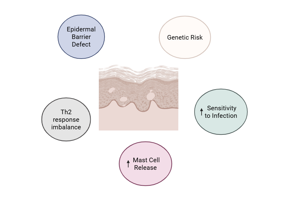- Epidermal barrier dysfunction leading to increased transepidermal water loss and enhanced allergen penetration