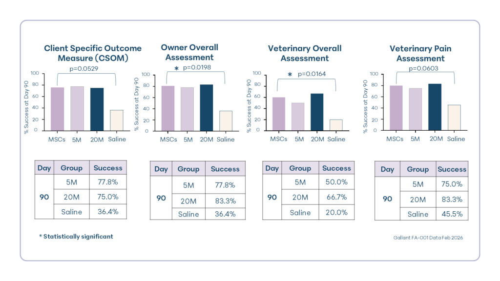 Osteoarthritis (OA) is a common and often underdiagnosed condition in cats. Recent studies suggest a probable immune-mediated component to the onset and progression of feline OA.1–3 Subtle behavioral changes including reduced activity, reluctance to jump, or changes in grooming can signal chronic joint pain that significantly impacts quality of life.4 A recent Gallant pilot clinical study evaluated the safety and efficacy of intravenous uterine-derived mesenchymal stromal cells (UMSCs) in cats with naturally occurring osteoarthritis.