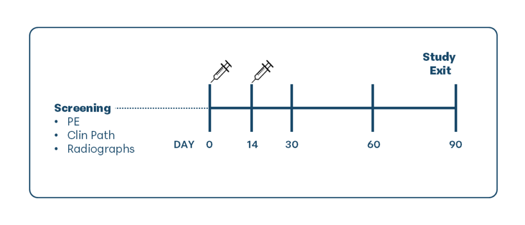 This randomized, masked, placebo-controlled clinical field study was conducted across 6 veterinary clinics in the United States and enrolled 35 client-owned cats with radiographically confirmed osteoarthritis in at least 2 joints, with pain in at least one arthritic joint. Cats were randomly assigned to receive 2 intravenous injections, administered 14 days apart, of either low-dose UMSC therapy (5 million cells), high-dose UMSC therapy (20 million cells), or saline placebo.