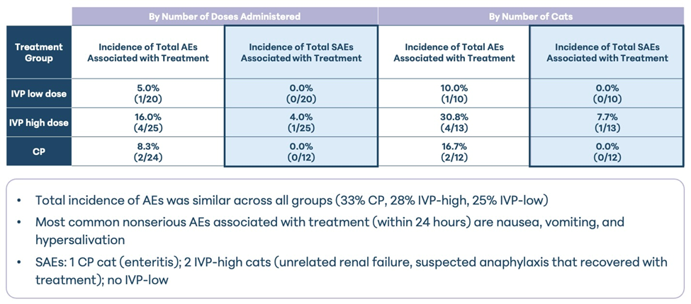 The study demonstrated statistically significant and clinically relevant improvement in both owner and veterinary outcomes in cats treated with intravenous UMSC therapy compared with placebo. Efficacy results for the 5 million and 20 million doses were similar.